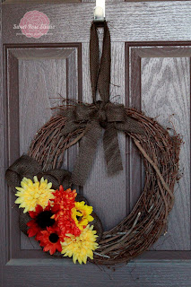 Using a pre-made wreath form, some seasonal supplies, and some ribbon, is often all that you need to decorate your door, bringing the spirit of the season to the street. I love this Fast and Easy Fall Wreath by Sweet Rose Studio. I love all the texture – the twigs of the wreath form, the burlap “ribbon,” and the fluffy mums… three great fall textures!