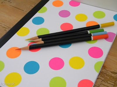 Carolyn from Homework spiced up an otherwise boring notebook with Astrobrights paper! Check out her technique, and then think about all the other fun places that are screaming for neon polka dots… folders, lunchboxes, pencil cases… I’m sure there are more!
